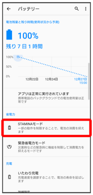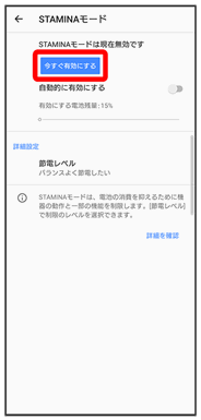 | STAMINAモード | 画面の描画速度やバックグラウンド通信、GPS機能などの動作を制限して電池の消費を抑えるようにするかどうかを設定できます。 | |
