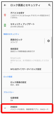 | 詳細設定 | ・パスワードの表示 PINコード/ロックNo./パスワードの入力画面で、「●」が表示される前に入力した文字を表示するかどうかを設定します。 ・機器管理アプリ 機器管理アプリの有効/無効の設定をします。 ・SIMカードロック設定 SIMカードロックに関する設定をします。 ・暗号化と認証情報 暗号化と認証情報に関する設定をします。 ・信頼できるエージェント 信頼できるエージェントの有効/無効の設定をします。 ・画面のピン留め 本機で特定のアプリの画面だけが表示されるように設定します。ONにすると、固定した画面は移動できなくなります。 |