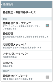 | 音声着信のポップアップ | ![]() | アプリケーション使用中に着信ポップアップを表示するかどうかを設定します。着信ポップアップ表示中は、各アイコンをタップすると電話を受けたり、拒否したりなどの操作ができます。 |