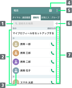 オプションメニューが表示されます。オプションメニューでは削除、共有、メッセージを送信、メールを送信、短縮ダイヤル、連絡先の管理、タブの編集、設定ができます。