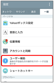 | ユーザー補助のショートカット | ![]() | 電源キーを長押しして画面を2本の指でロングタッチすることですぐにユーザー補助機能を有効にできるように設定します。 |