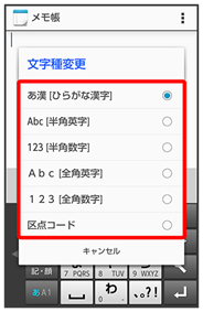 をタップするたびに、「半角英字入力」→「半角数字入力」→「ひらがな漢字入力」の順に文字種(文字入力モード)を切り替えることができます。