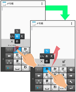 キーをロングタッチすると、キー入力ガイドが表示されます。キーにタッチしたまま入力する文字の方向へフリックし、入力します。