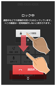 通話中に一定時間操作しないと、誤操作防止ロック画面が表示され、タッチ操作が無効になります。操作するときは、ロック解除を下にドラッグしてロックを解除してください。