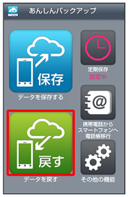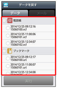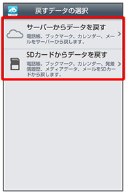 サーバー/SDカードなどに保存した電話帳データ/ブックマークデータ/カレンダーデータ/発着信履歴データ/画像データ/音楽データ/動画データから、データを選択して本体に戻すことができます。
