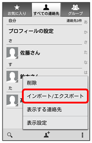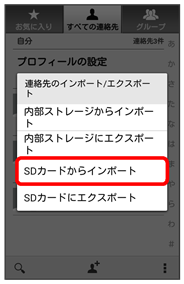 SDカードにバックアップした電話帳をインポート(読み込み)できます。あらかじめ、SDカードを取り付けておいてください。詳しい手順は「SDカードを取り付ける」を参照してください。