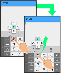 キーをロングタッチすると、キー入力ガイドが表示されます。キーにタッチしたまま入力する文字の方向へフリックし、入力します。