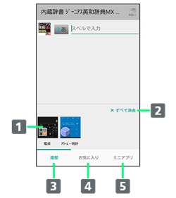 クイックランチャーを、アプリ使用履歴に切り替えることができます。アプリ使用履歴では、アプリケーションの使用履歴の一覧を表示して、アプリケーションを起動したり、履歴を削除したりできます。切り替え方法について詳しくは、「アプリ使用履歴キーの設定」を参照してください。