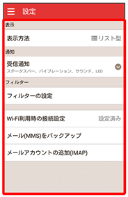 | 受信通知2 | ![]() | 新着メール受信時の着信音やバイブレーション、着信ランプなどを設定します。 |