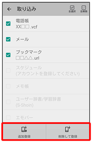 ほかの機器や本機で保存したデータ(電話帳、メール、ブックマーク、スケジュール、メモ帳、ユーザー辞書/学習辞書、エモパー)を、本機に取り込むことができます。