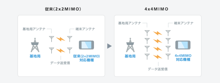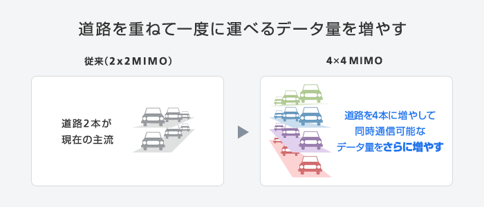 道路を重ねて一度に運べるデータ量を増やす 従来(2×2 MIMO)道路2本が現在の主流 → 4×4 MIMO 道路を4本に増やして同時通信可能なデータ量をさらに増やす