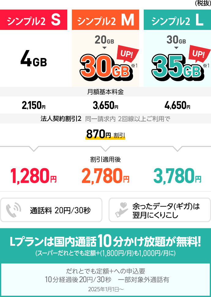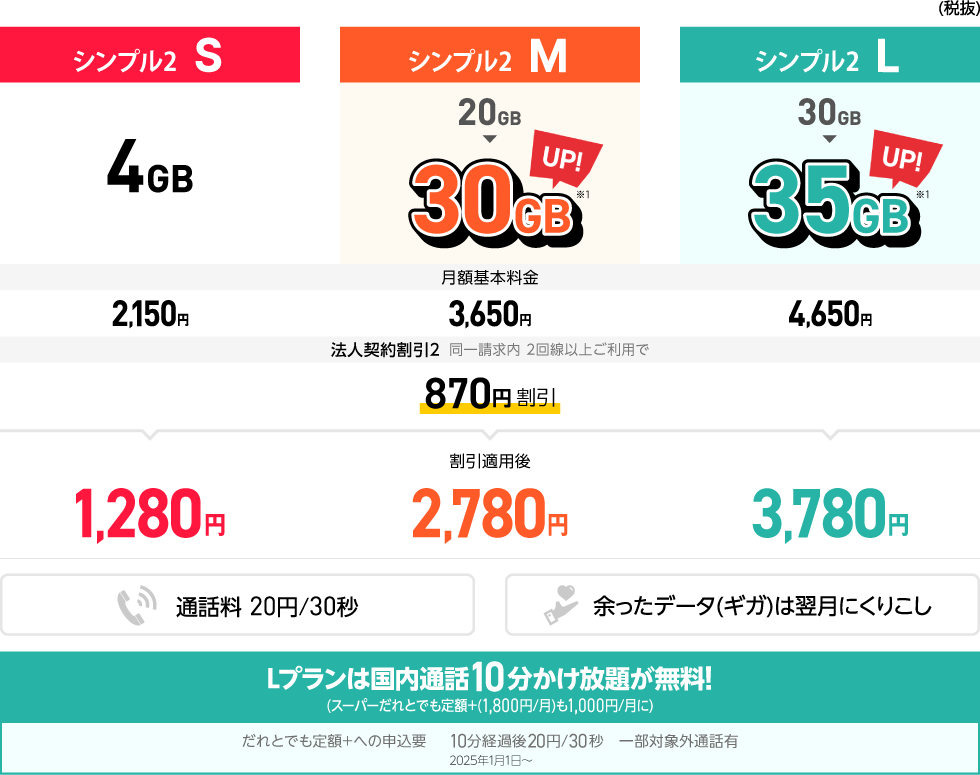 | 料金プラン | シンプル3 S | シンプル3 M | シンプル3 L |