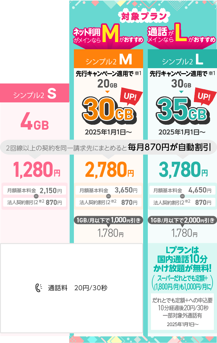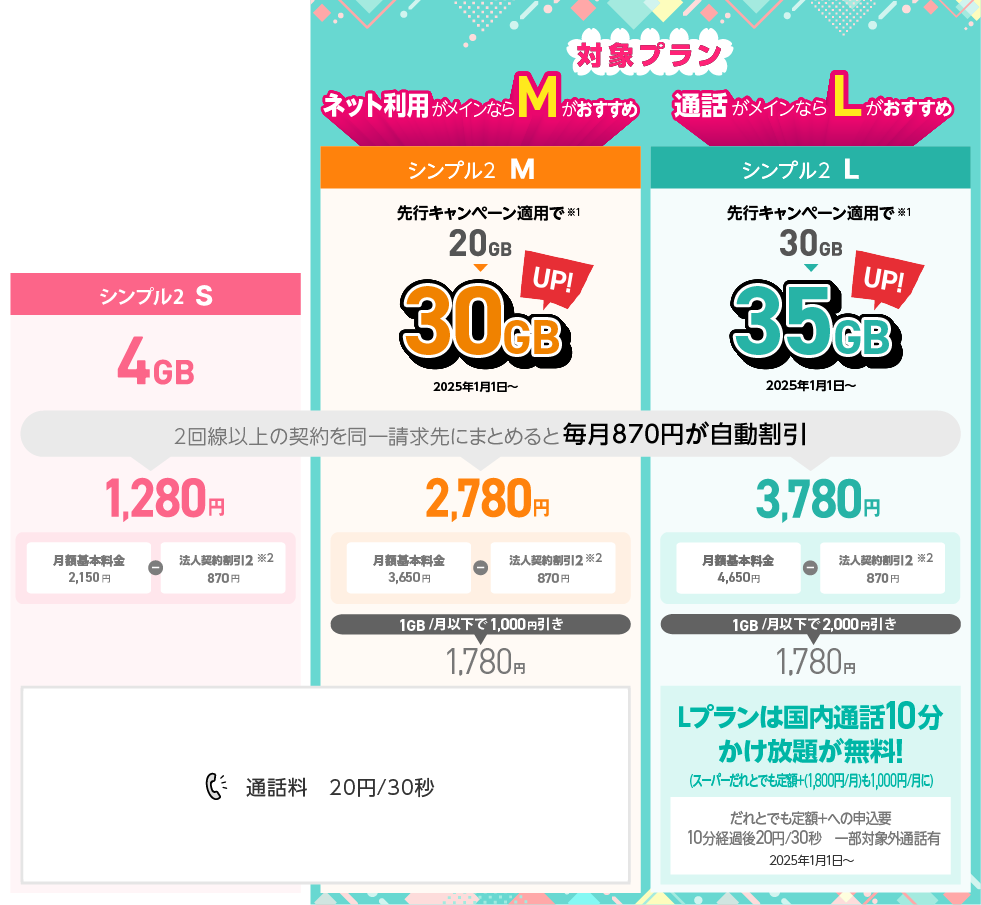ワイモバイル法人オンラインストアもしくはワイモバイル法人ダイレクトで新規ご契約(他社からの乗り換え含む)のお客さまで、キャンペーン期間中にワイモバイルへの「シンプル2 M」もしくは「シンプル2 L」のお申し込みが完了し2025年5月31日(土)までにご契約登録が完了※したお客さま