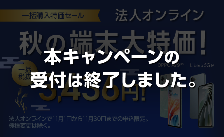 ワイモバイルへのお申し込みと同時に端末を購入することで、人気のスマホ「OPPO A79 5G」と「Libero 5G IV」が16,560円値引きとなる特価セールを開催しております。11月1日(金)~11月30日(土)までの期間限定で、ワイモバイル法人オンラインストアとワイモバイル法人ダイレクトより、対象機種を一括3,436円(税抜)で販売いたします。