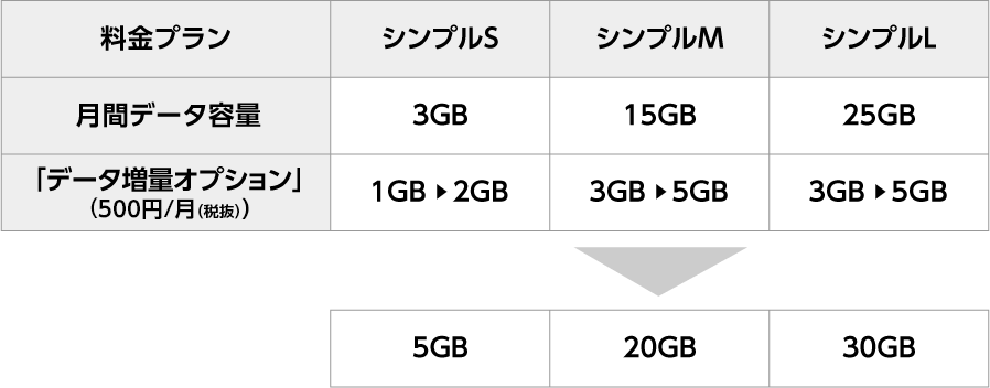 同時に「シンプルS/M/L」について、「データ増量オプション」の内容を改定します。