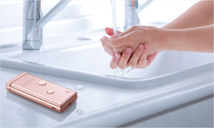 料理中や入浴中でもすぐ電話に出られる防水設計で、水洗いも可能です。防塵設計も備え、アウトドアでもチリやホコリを気にせず使えます。(キャップレス防水仕様)