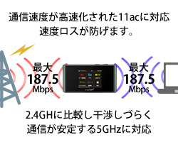 超高速通信を快適に利用できるIEEE802.11acに対応。さらに、5GHzに対応することで他のWi-Fi機器との干渉を減らし、安定した通信品質で高速通信をご利用いただけます。