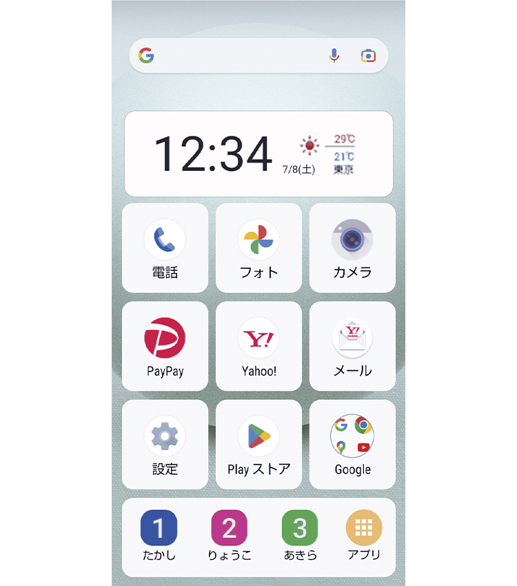 シンプルで操作がしやすいホーム画面を搭載。太字や特大フォントで、見やすく読みやすい表示に設定できます。