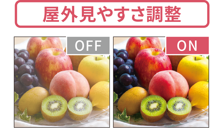 まぶしい屋外でも画面を見やすく調整します。 また、文字も読みやすさを重視しています。