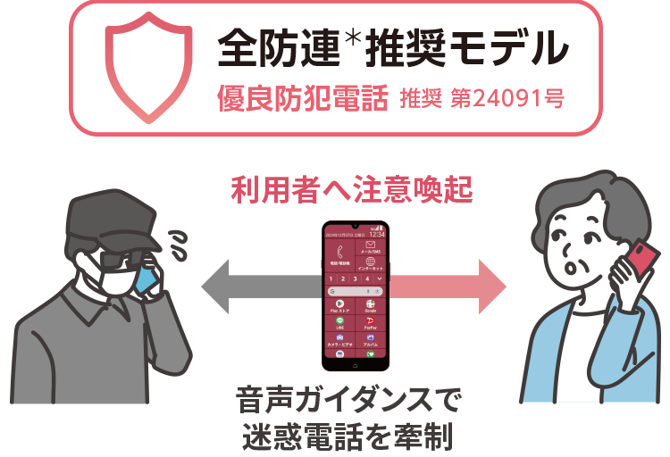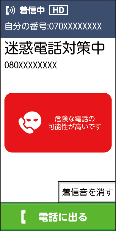 詐欺などの迷惑電話対策の機能を搭載。あやしい電話を画面表示でお知らせ。