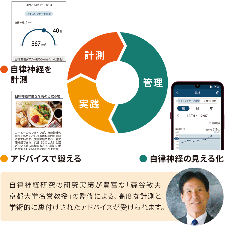 センサーに指を密着させるだけで自律神経の状態を計測、見える化。 それをもとにアドバイスを受けられます。