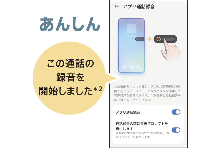 通話相手に会話が録音されることを知らせ、詐欺・迷惑電話を防止する通話録音機能を搭載。LINE通話などの一部アプリ※1にも対応しました。