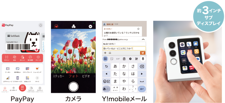 折りたたんだ状態でもアプリの操作が可能な約3インチの大型サブディスプレイを採用しました。