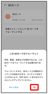 - フォーマットすると、SDカード内のデータがすべて消去されます。ほかの機器で使用したSDカードをフォーマットするときは、あらかじめよくご確認のうえ、操作してください。