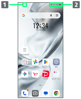 ステータスバーは、本機の画面上部にあります。新着メールなどの通知アイコンや、本機の状態をお知らせするステータスアイコンが表示されます。