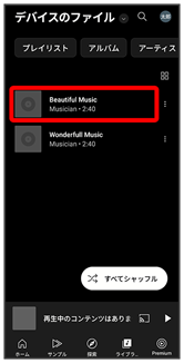 公式アルバムやミュージックビデオなど幅広い音楽コンテンツが楽しめます。ここでは内部ストレージ/SDカードに保存されている音楽を再生する操作を例に説明します。
