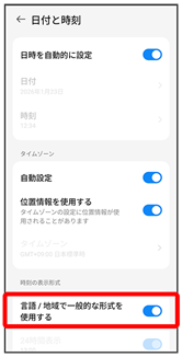 )が切り替わります。 - 言語/地域で一般的な形式を使用するがOFFの場合は、24時間表示をタップするたびに、24時間表示(