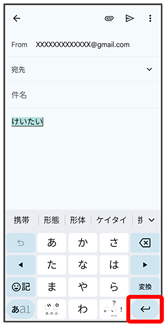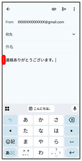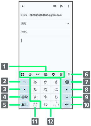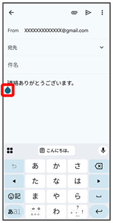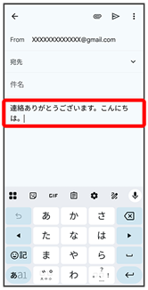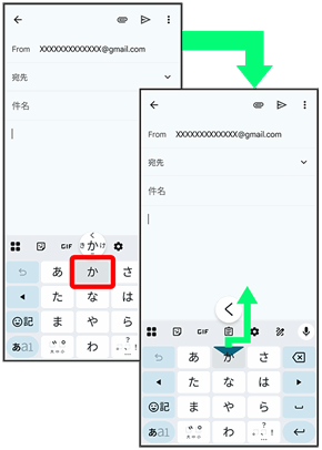 キーを上下左右にフリックすることで、キーを繰り返しタップすることなく、入力したい文字を入力できます。キーに触れると、フリック入力で入力できる候補が表示されます。入力したい文字が表示されている方向にフリックすると、文字が入力されます。