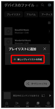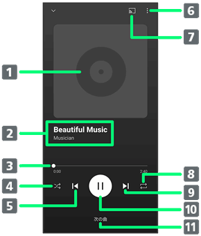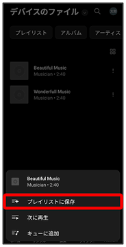 公式アルバムやミュージックビデオなど幅広い音楽コンテンツが楽しめます。ここでは内部ストレージ/SDカードに保存されている音楽を再生する操作を例に説明します。