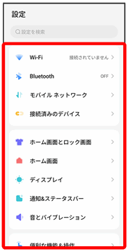 | モバイル ネットワーク | モバイルネットワーク、データ使用量など、ネットワークやインターネットに関する設定ができます。 | |