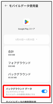 | バックグラウンドデータの通信 | バックグラウンドデータの通信を制限します。詳しくは、「バックグラウンドのモバイルデータ通信を制限する」を参照してください。 | |