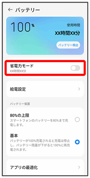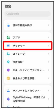 バッテリーの使用状況を確認したり、バッテリーの消費を軽減する設定ができます。