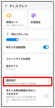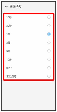 | 画面消灯 | 画面が自動で消灯するまでの時間を設定します。 | |