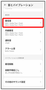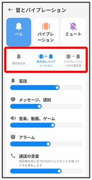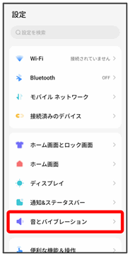 着信音、操作音など、音やバイブレーションに関する設定ができます。