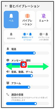 | メッセージ、通知 | メッセージや通知音の音量を設定します。 | |