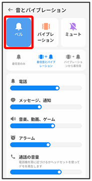 | ベル | 着信音をオンにします。着信音のみ/着信音とバイブレーション/バイブレーションから着信音を設定します。 | |