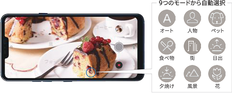 シーンに合わせたベストショットが撮れるAI(人工知能)カメラを搭載。 9つのカテゴリーから最適な撮影モードを自動選択します。被写体の特性を活かした撮影が可能です。