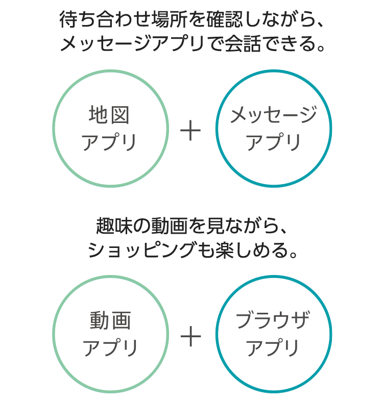 2つのアプリを同時に表示し操作できるマルチウィンドウ機能がとても便利。動画を見ながらSNSをしたり、ショッピングサイトを見比べたりできます。