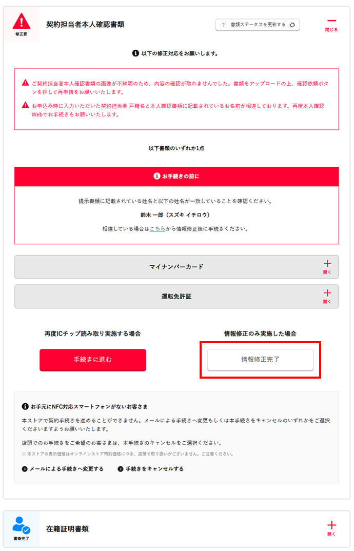 不備の内容に応じて、お客さま情報の修正や確認書類の再アップロードを行ってください。