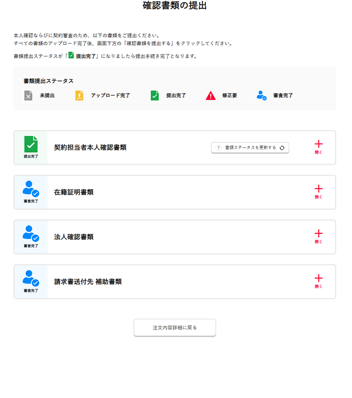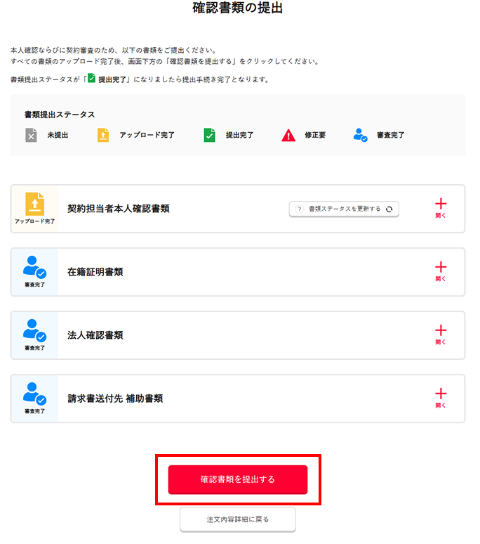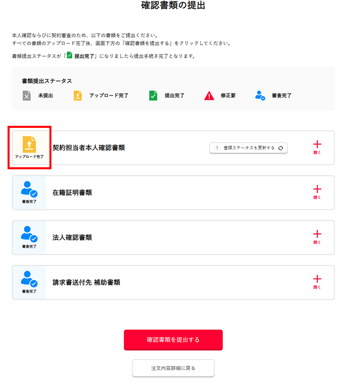 - 現状と必要書類記載事項が異なる場合には、必要書類の記載事項変更のお手続き後、改めて書類アップロードをしてください。