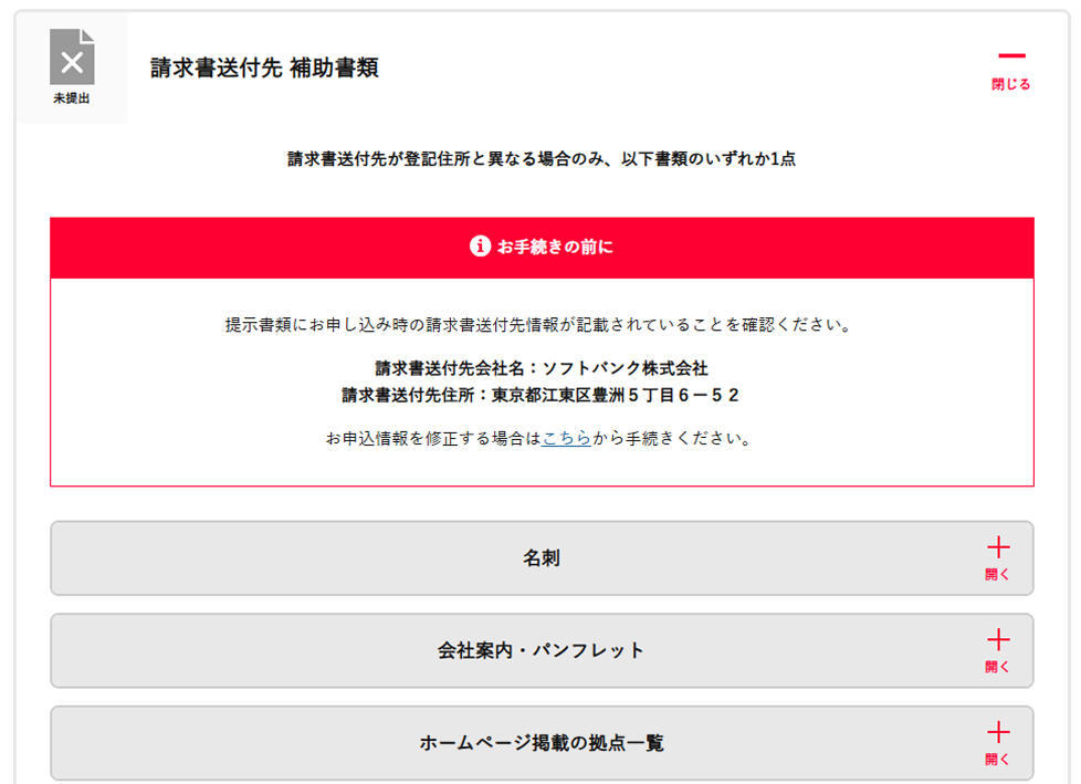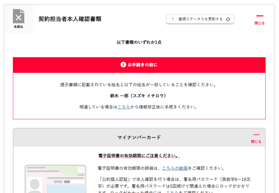 - ご提出の書類とお申し込み時の情報が一致していない場合は、お申し込み不備となります。アップロード書類を変更するか、お客さま情報の修正を行ってください。