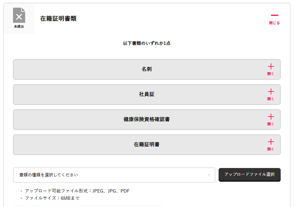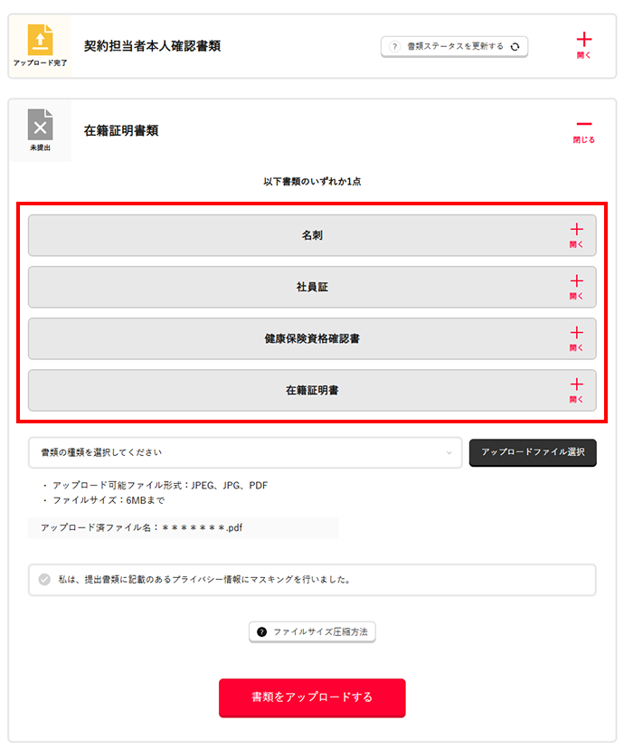 - 「確認書類アップロードのご依頼」というメールの受領後、13日以内に書類の提出が完了されない場合、お申し込みキャンセルとなりますのでご注意ください。