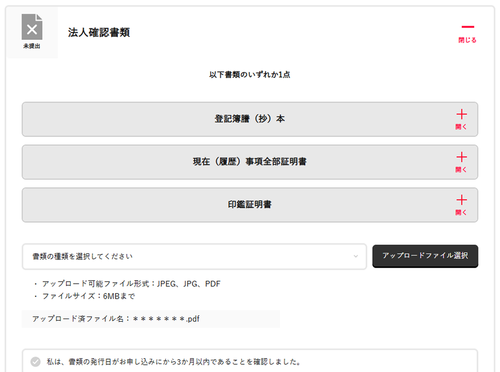 法人確認書類、営業証明書:pdf その他の書類:jpeg,jpg,pdf |