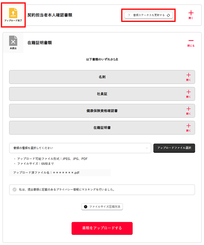 それぞれの書類アップロードエリアに書類提出・審査状況を示すステータスを表示しています。