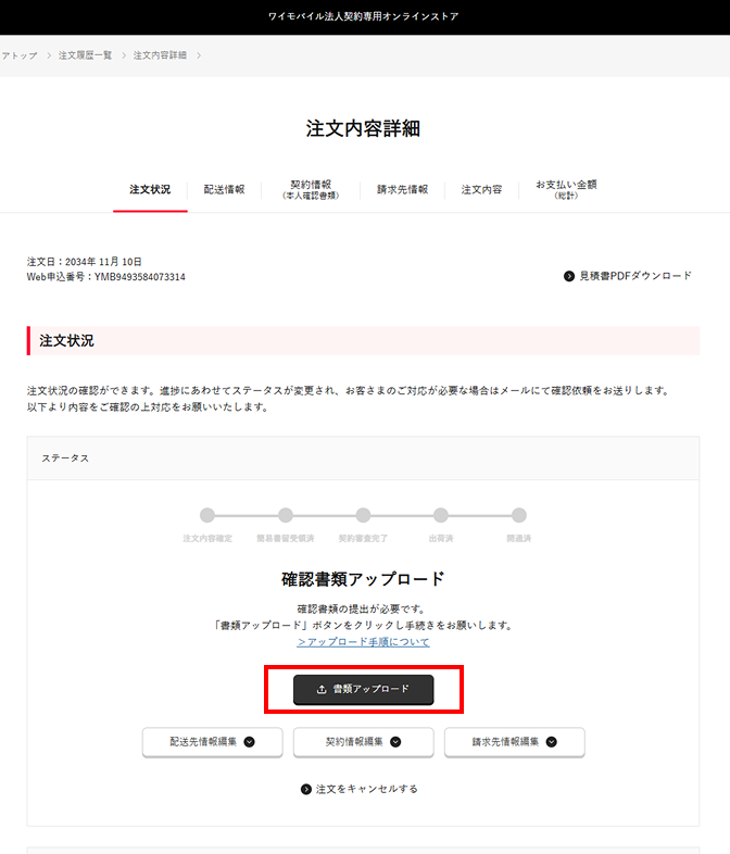 法人オンラインストアへログインし、注文履歴一覧より該当の注文内容詳細画面を表示して書類をアップロードしてください。