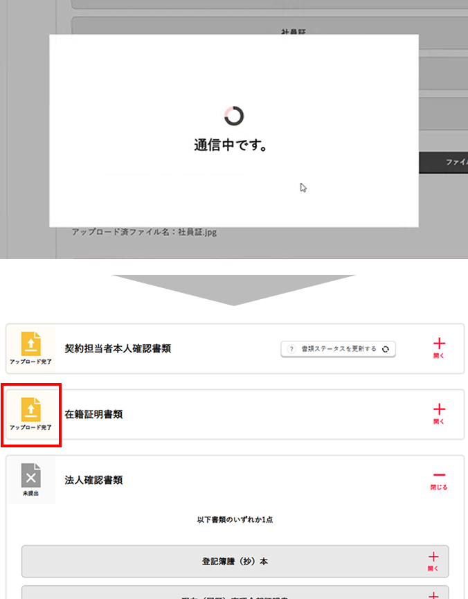 当該書類アップロードエリア内に表示されている修正対応メッセージをご確認いただき、対応をお願いいたします。